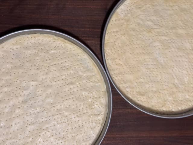 - Perforate the dough with a fork to allow air bubbles to escape... I usually spend 30-60 seconds doing this for each pan to make a ton of little holes.